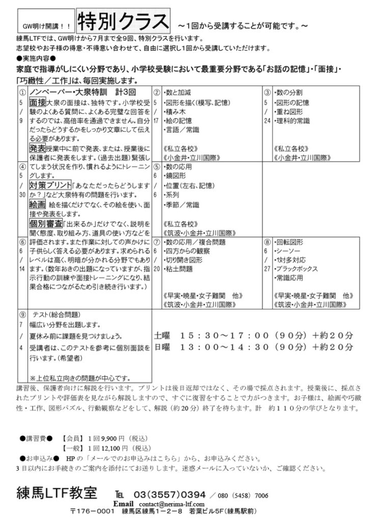 練馬LTFでの受験体験を通して 【きっかけ】 国立小学校に力を入れているお教室を探していました。 国立小の考査のポイントが全くわかっていなかったためです。 【入塾後】 体験時にはいい子に過ごしていた息子も、通ううちにどん […]